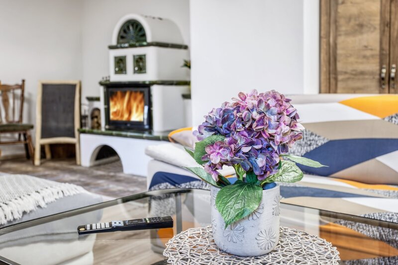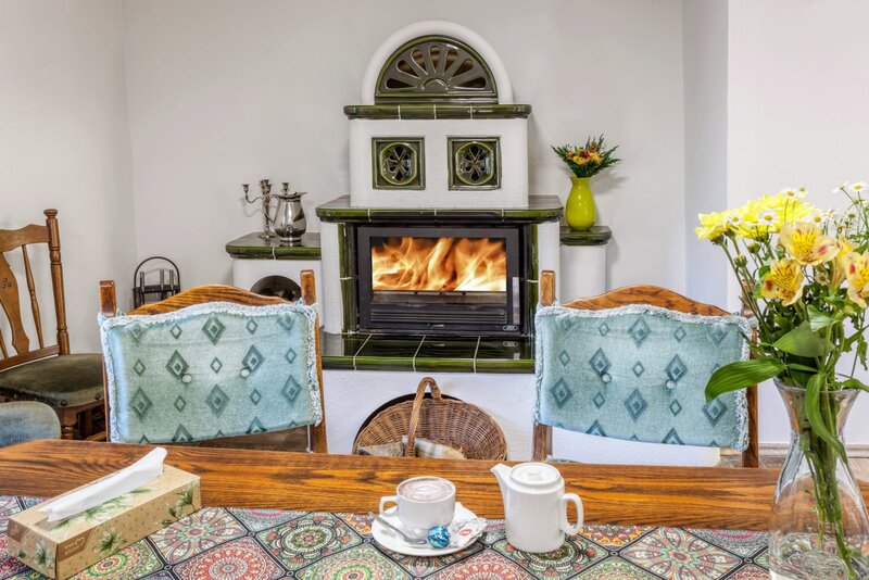 Vytápění krbem a el. přímotopy. Vodovod obecní. Kanalizace žumpa / vývoz