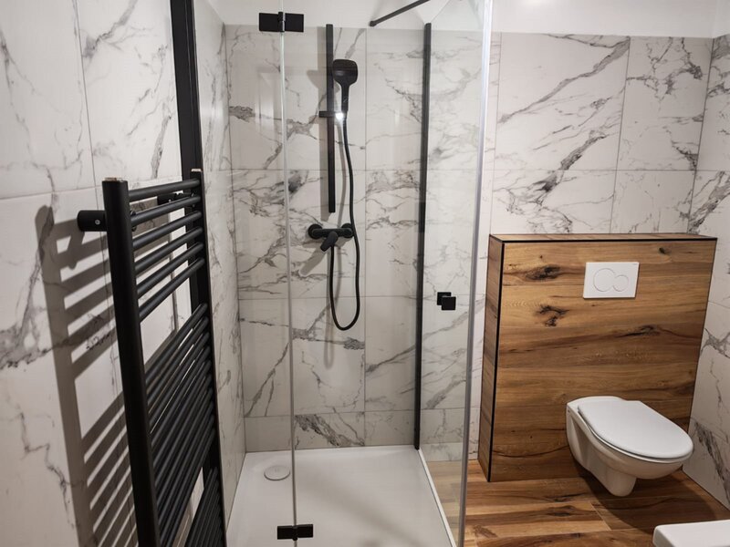 obložkové dveře, koupelna s proskleným sprchovým koutem, WC Geberit,